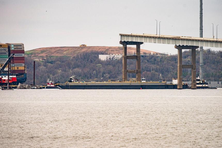 The ship, along with its crew of 22 Indian nationals, remains stranded in the Patapsco River. Huge chunks of the bridge, weighing up to 4,000 tons, collapsed on its deck.