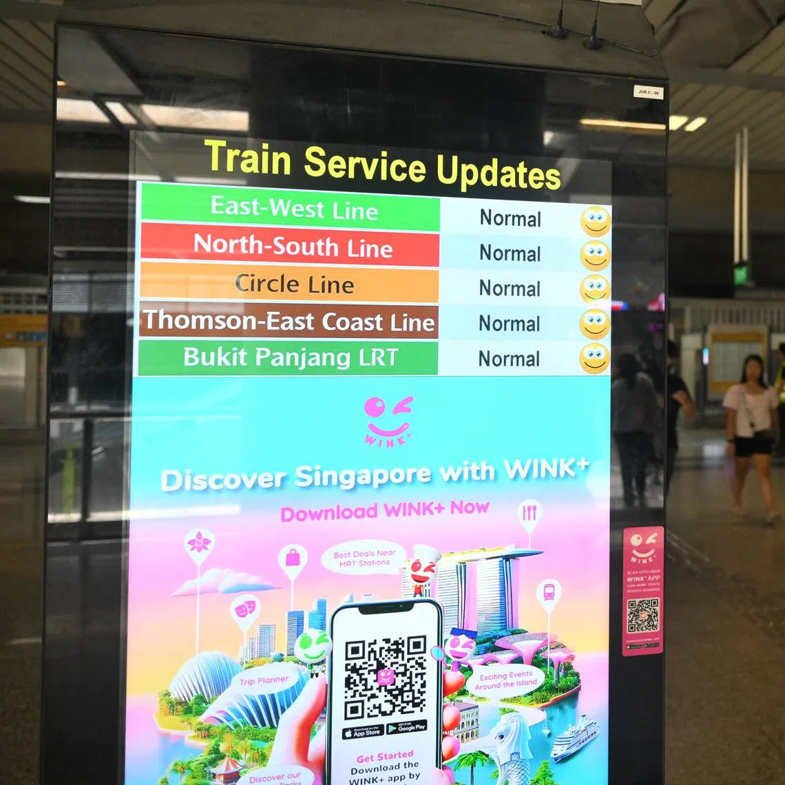 Screens showing that train services have returned to normal, seen at Jurong East MRT station at about 11.10am on Aug 6.
