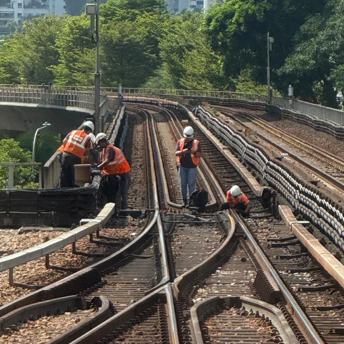 SMRT engineers fixing a track point fault near Jurong East MRT station on Aug 6.
