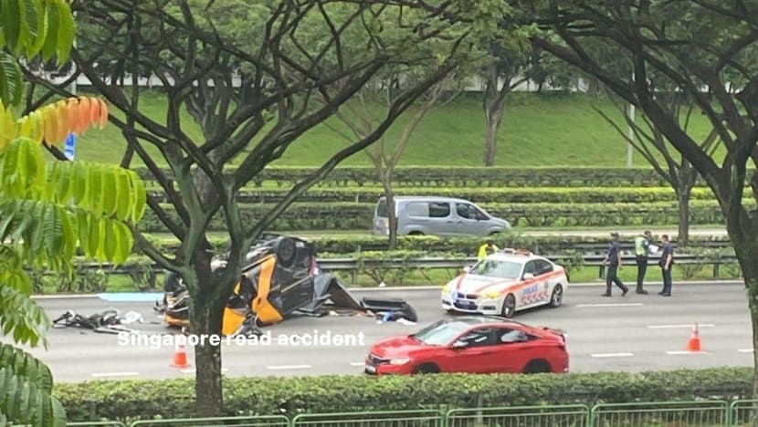 A van carrying Mr Michael Ong Wee Siong flipped on the Pan-Island Expressway during an accident on Dec 31, 2023. (Photo: Singapore Road Accident)