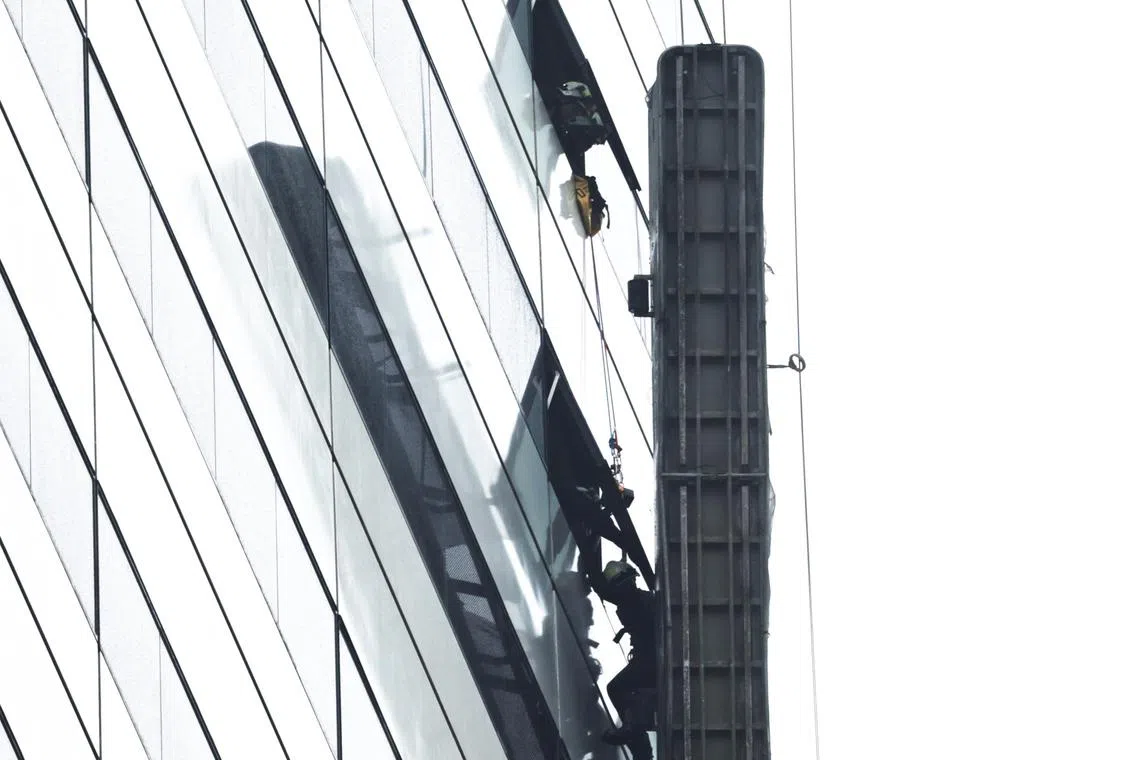 The workers, who were wearing body harnesses at the time, were then brought into the building through the windows on levels 29 and 30, SCDF said.